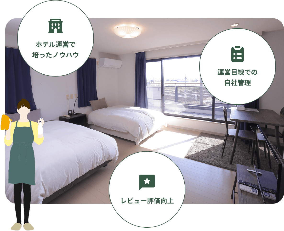 当社では、予約管理、ゲスト対応、清掃手配、消耗品管理、トラブル対応まで宿泊施設運営に必要な業務を一括で対応しています。対応範囲はオーナー様のご希望に応じて調整可能ですので、「一部だけ任せたい」といったご相談も可能です。