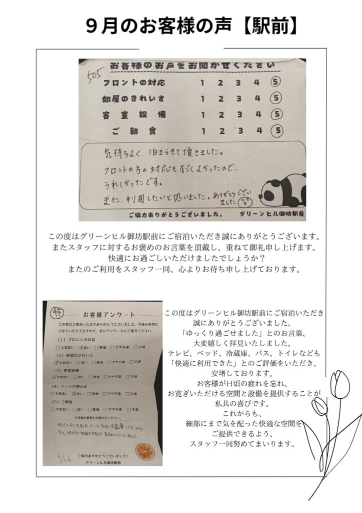 【9月】いただいた口コミ【グリーンヒル御坊駅前_御坊・日高の宿泊施設】